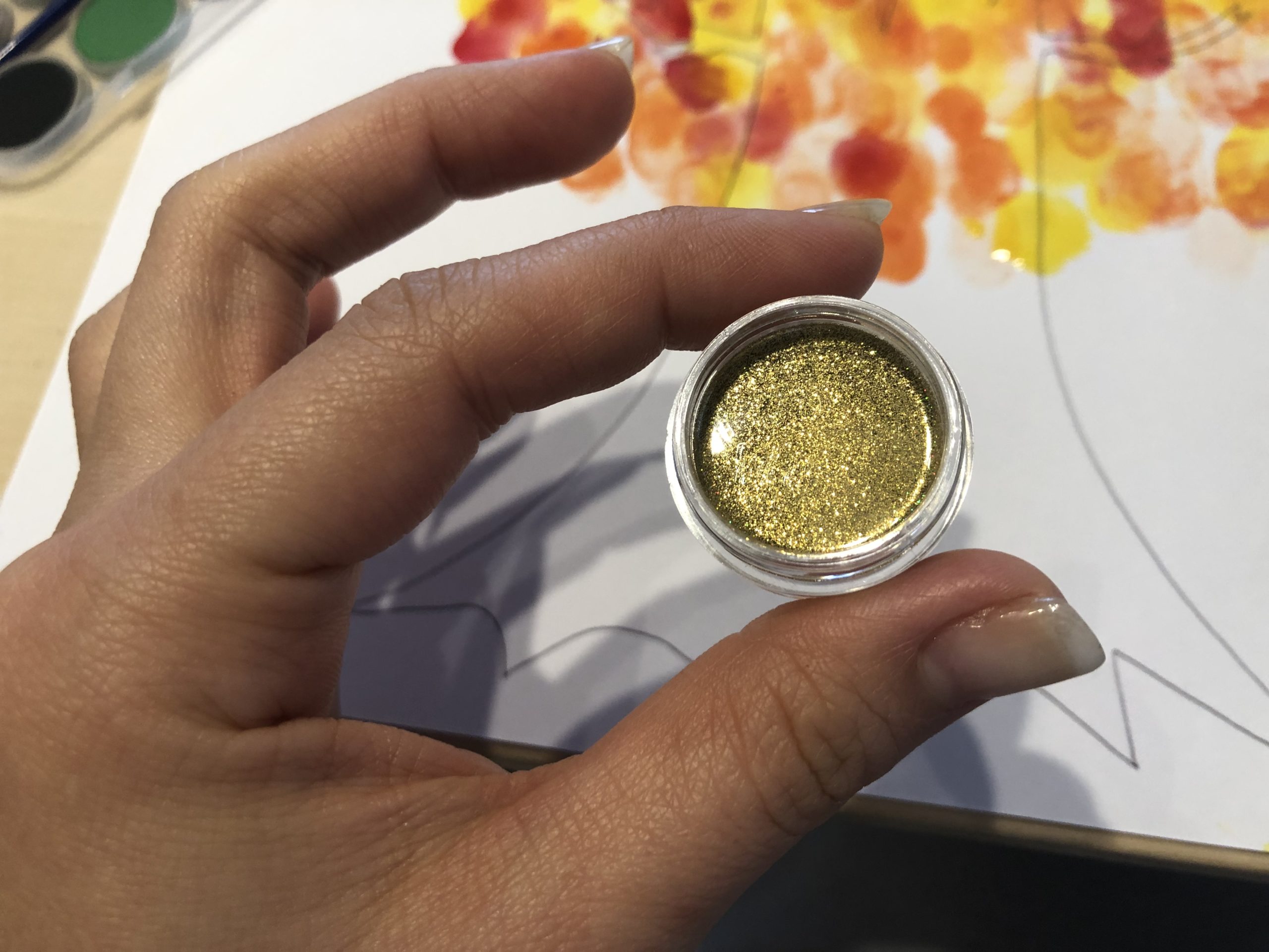 上からパラパラと落としていきましょう。金や赤のグリッターだと秋らしくなります。