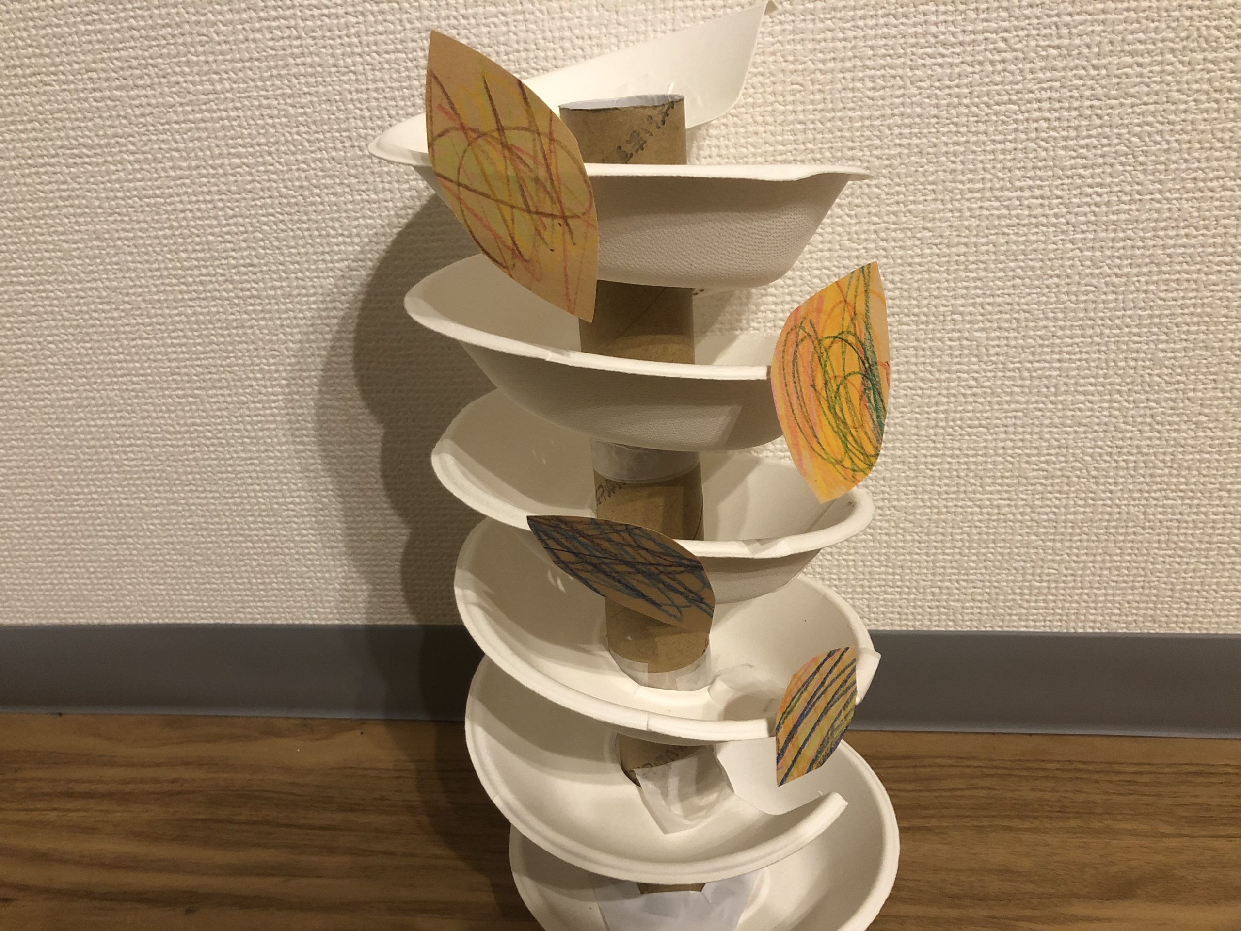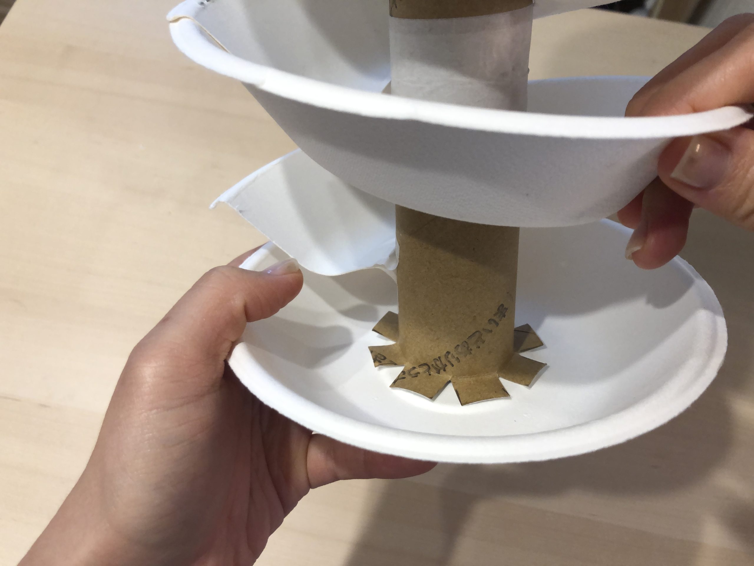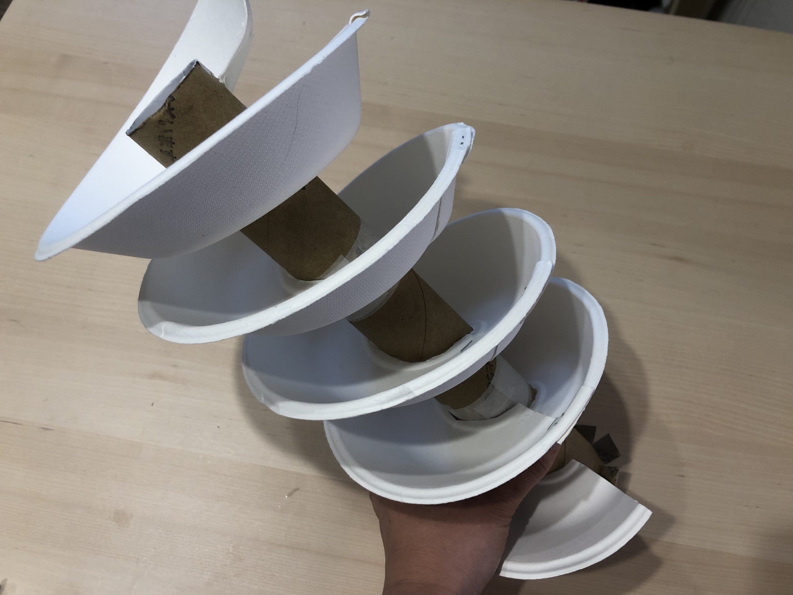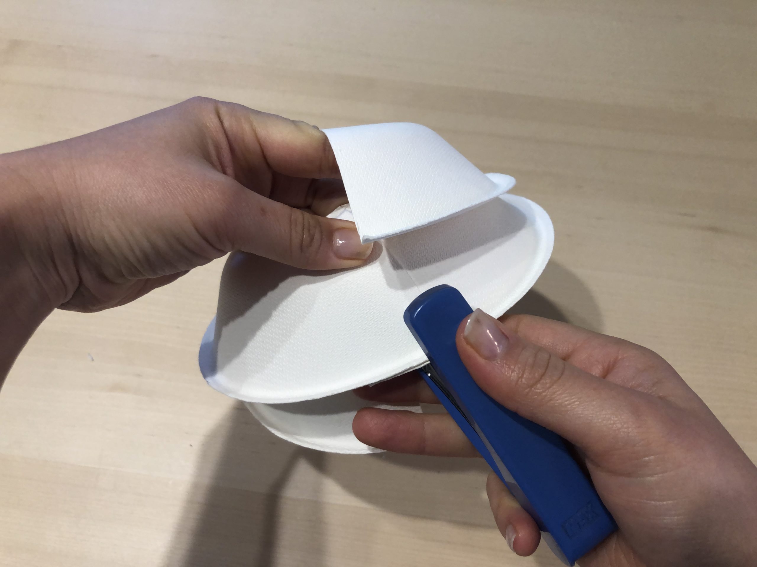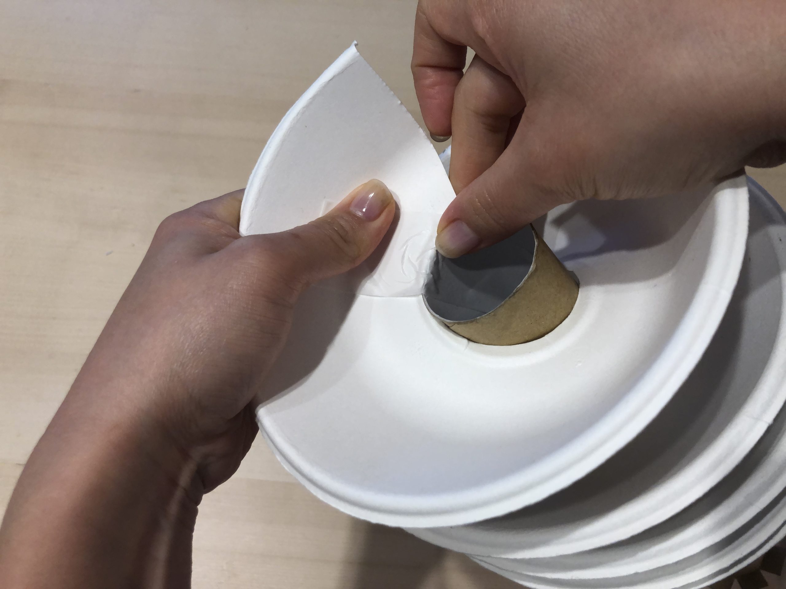 7.紙皿をらせん状になるようにして、ホチキスで止める