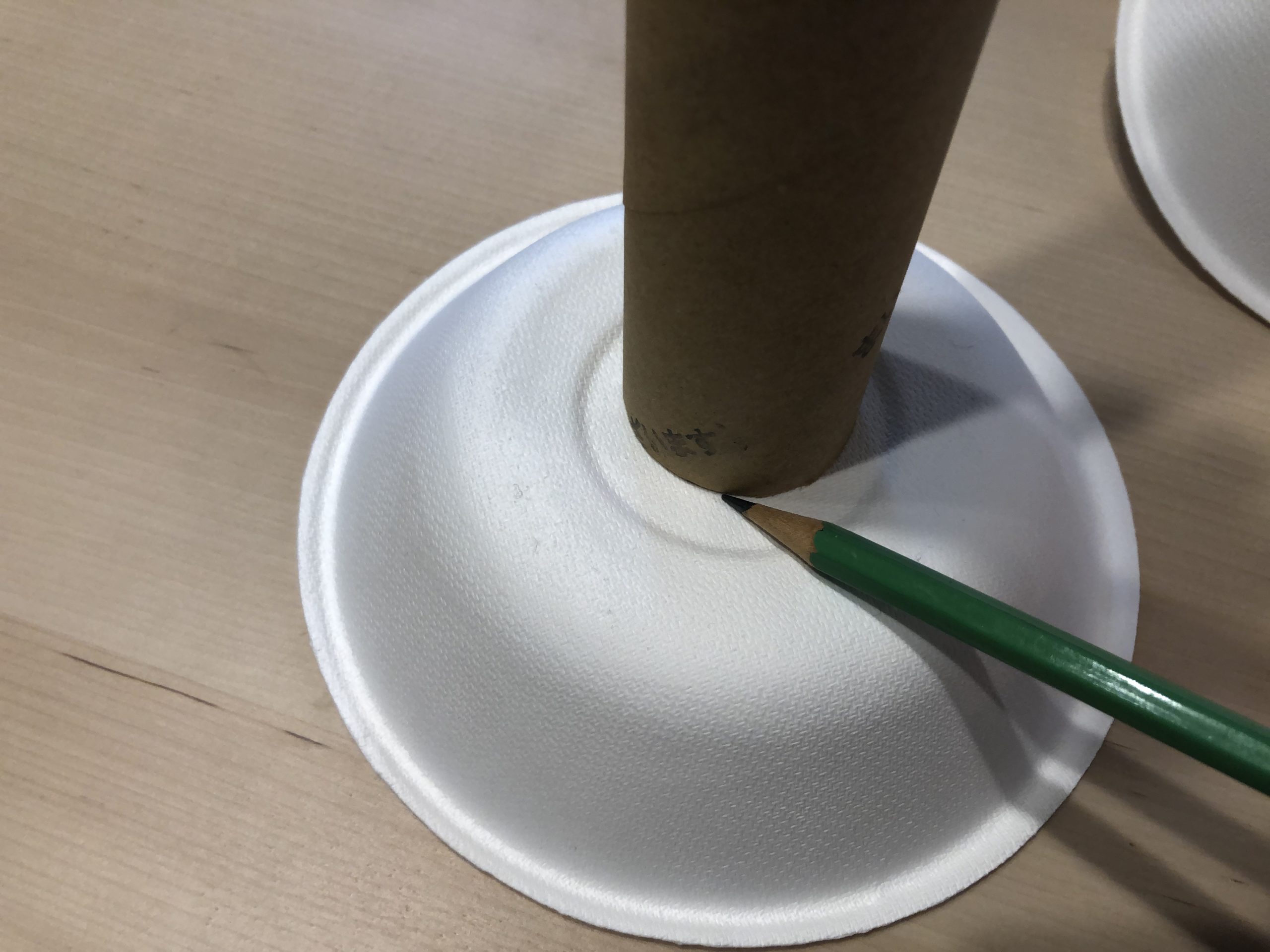 芯を紙皿に当てながら、鉛筆で縁取りましょう。