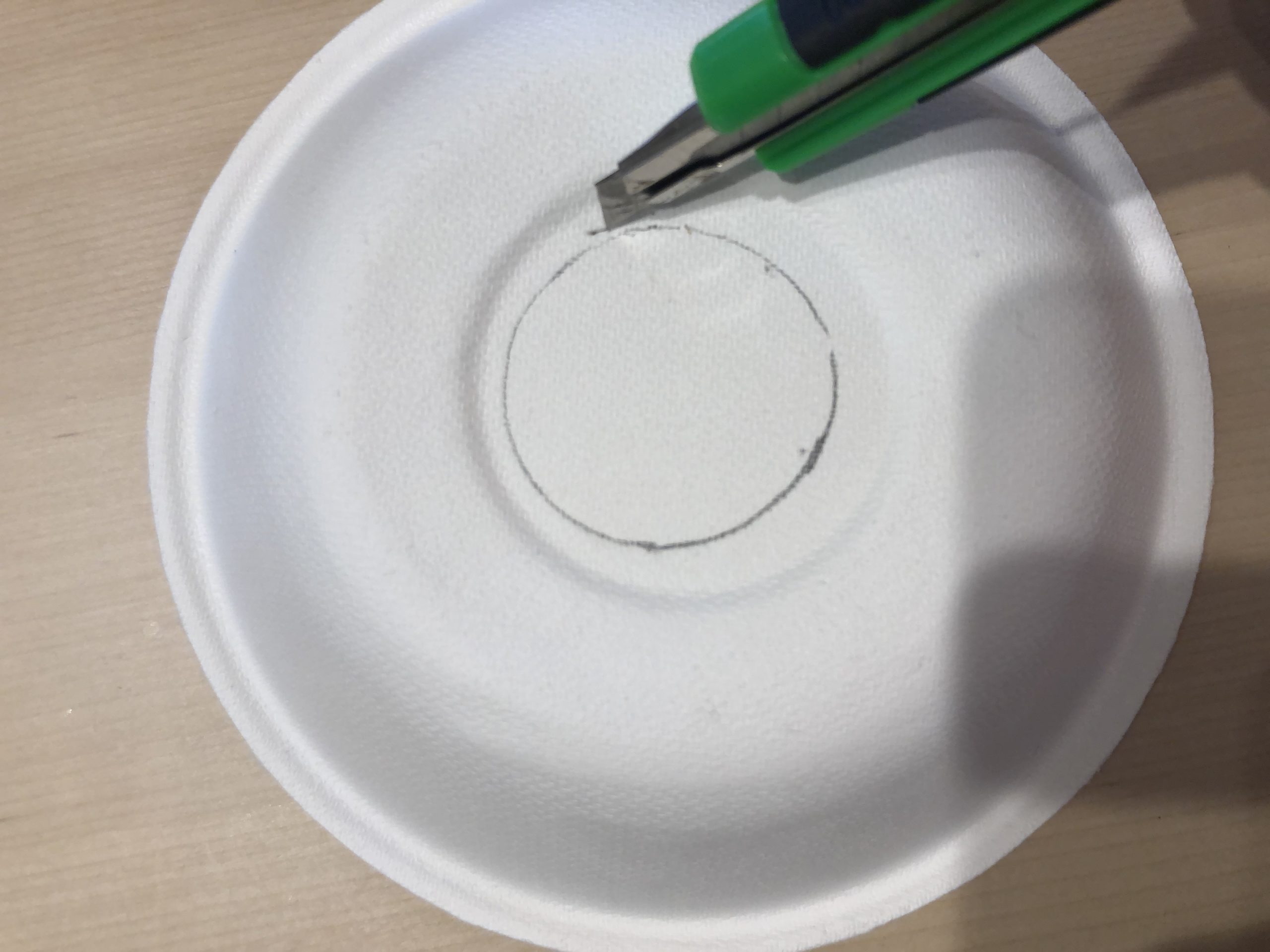 4.切り込みを入れていない方を使って、紙皿に丸を縁取る