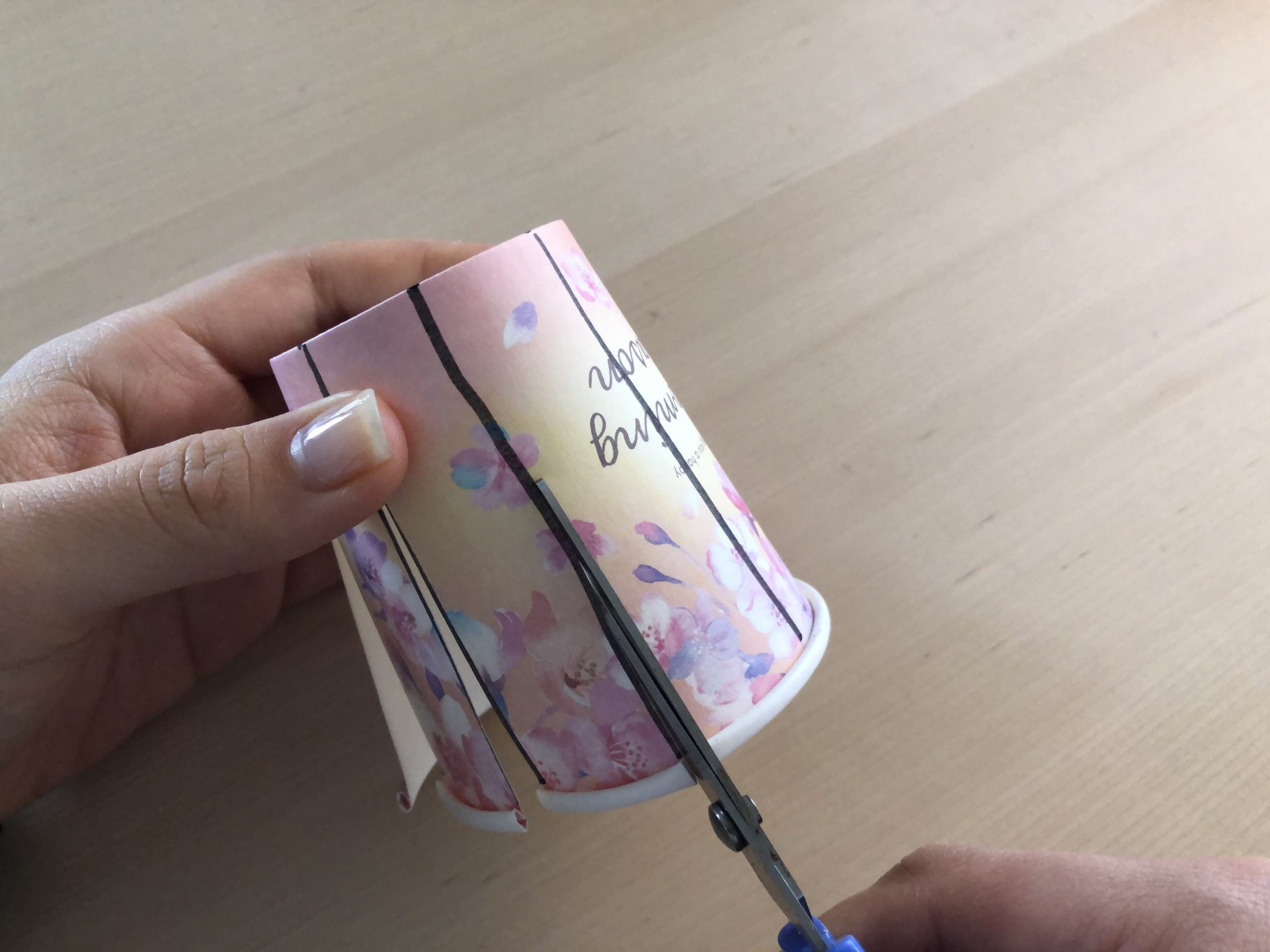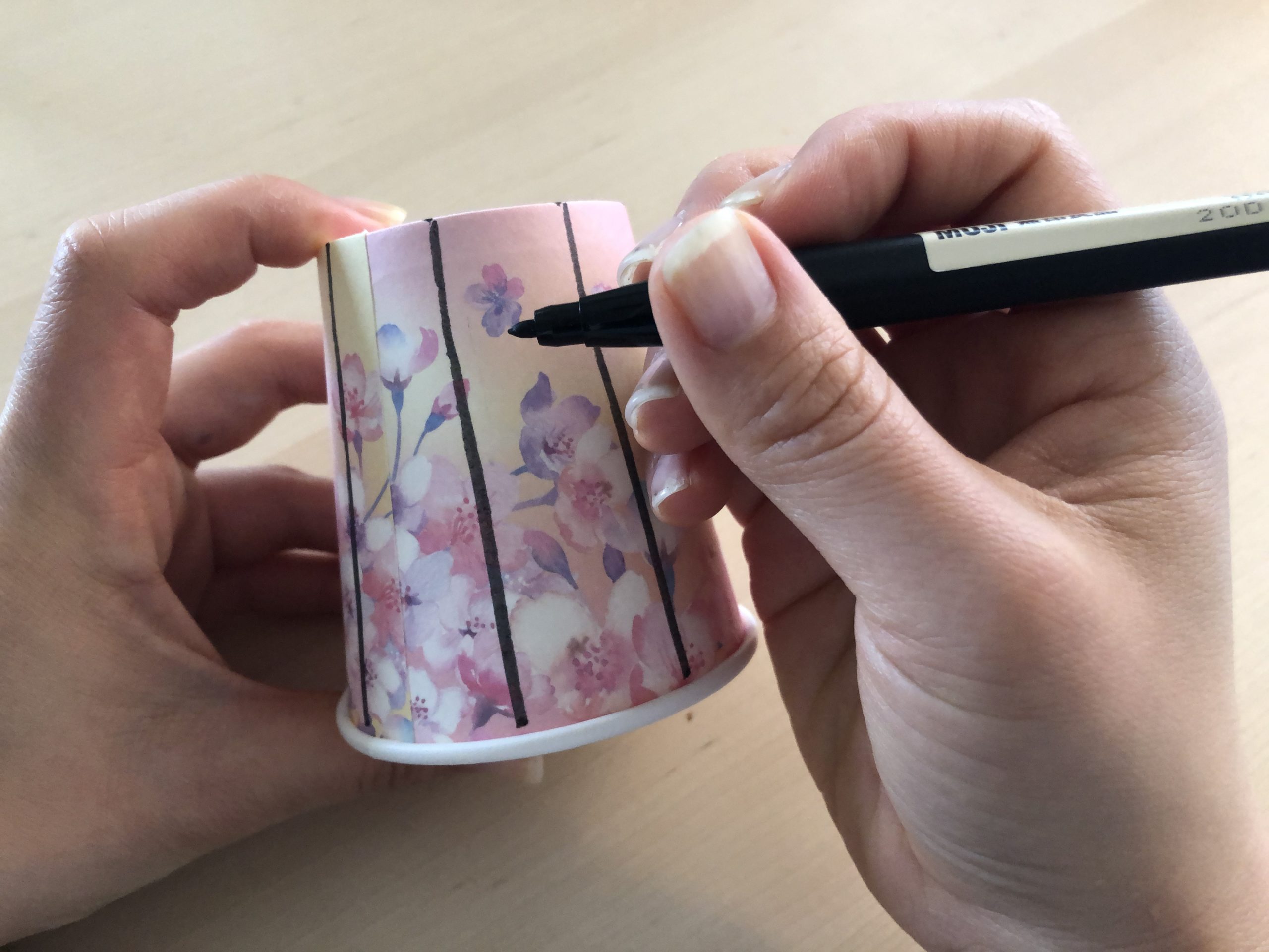 2.ペンで1つの紙コップに切り込み線を書く
