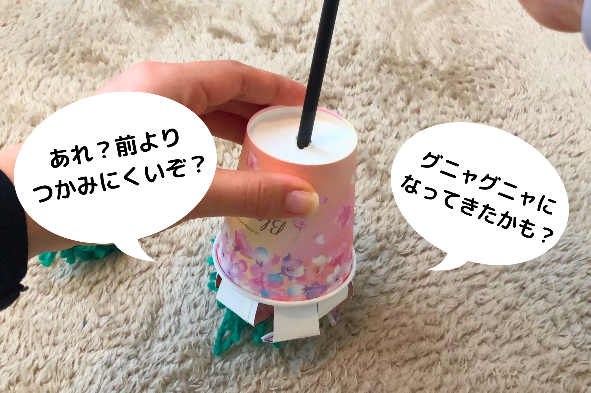 紙コップは普通の紙より丈夫ですが、何度も遊んでいるとアーム部分が弱くなります。