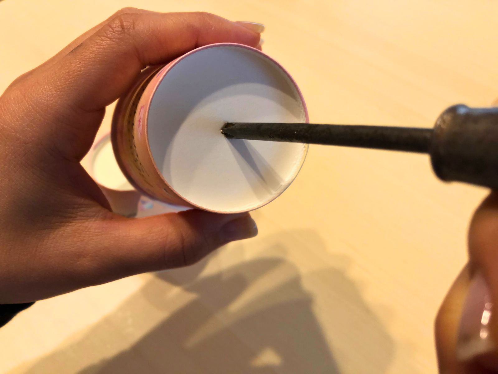 コップの底までしっかり切るように伝えましょう。切り始め(飲み口部分)は少し力がいるかもしれません。